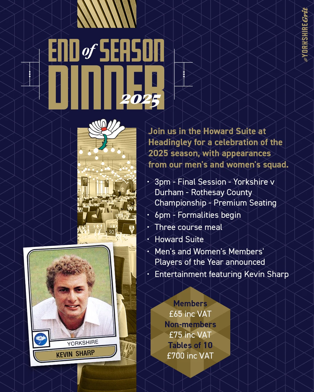 Tickets to the event includes Premium Seating for the final session of Yorkshire’s clash with Durham, with formalities including a three course meal and the hotly anticipated announcement of Yorkshire’s Men’s and Women’s Members’ Player of the Year.