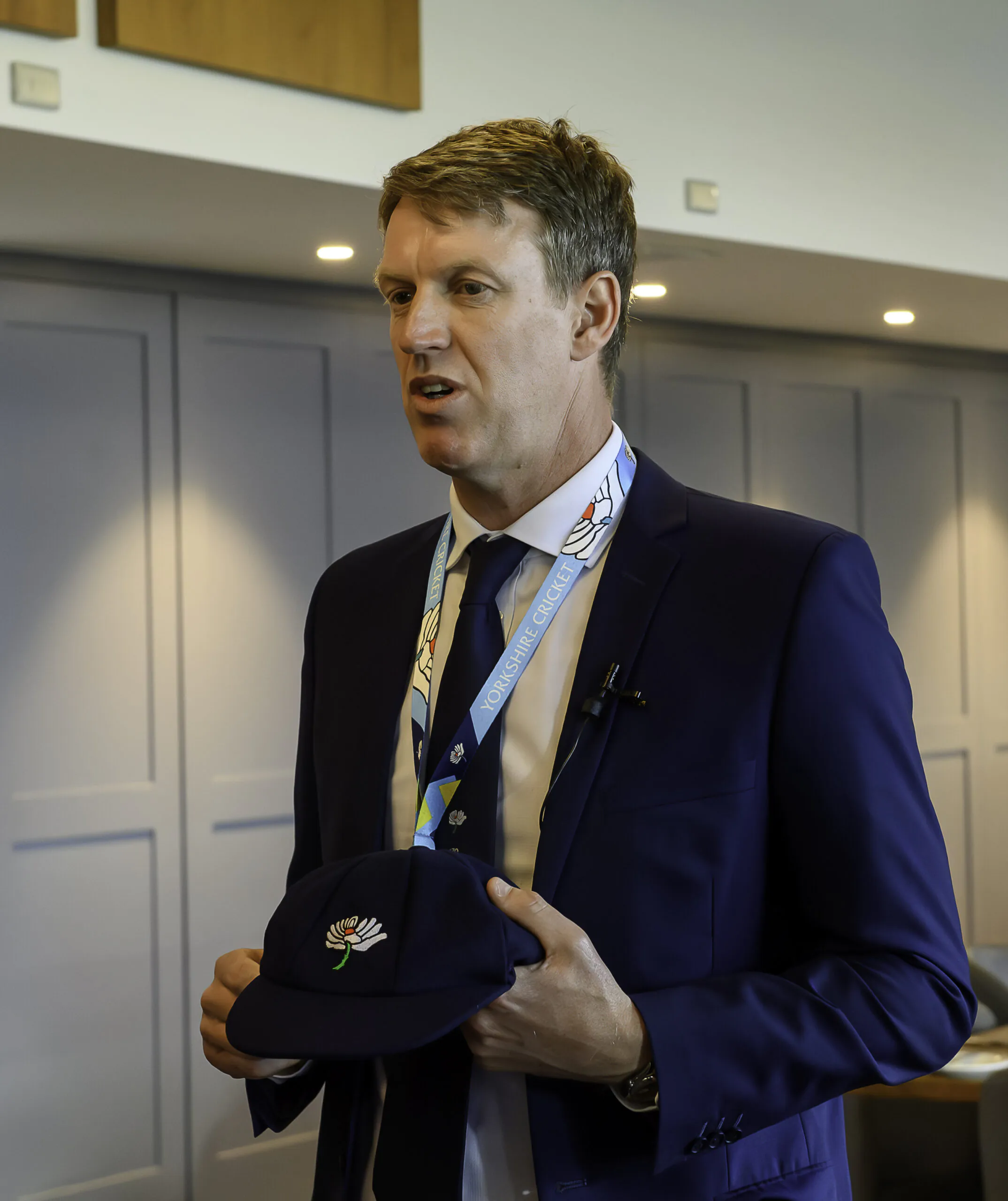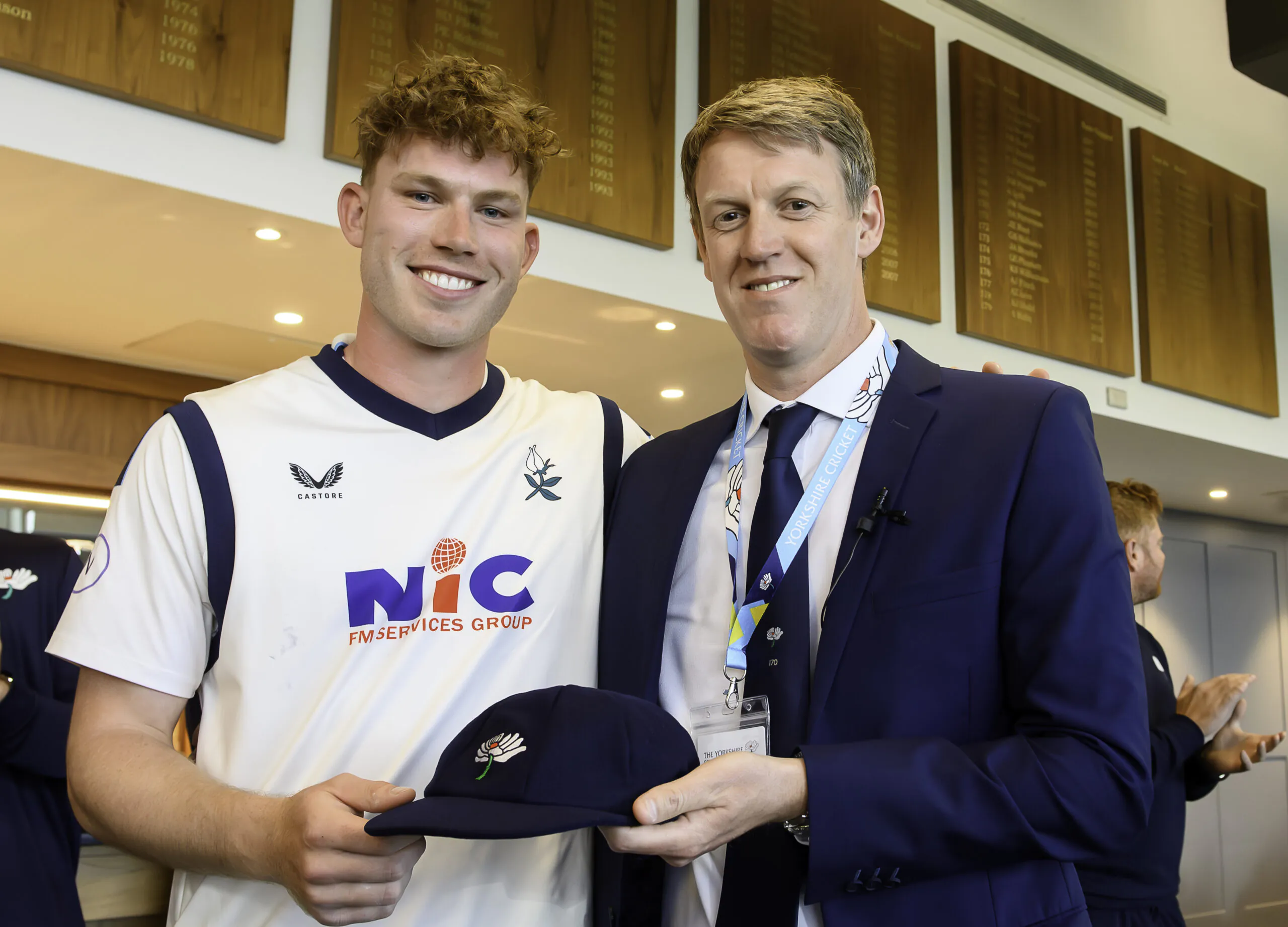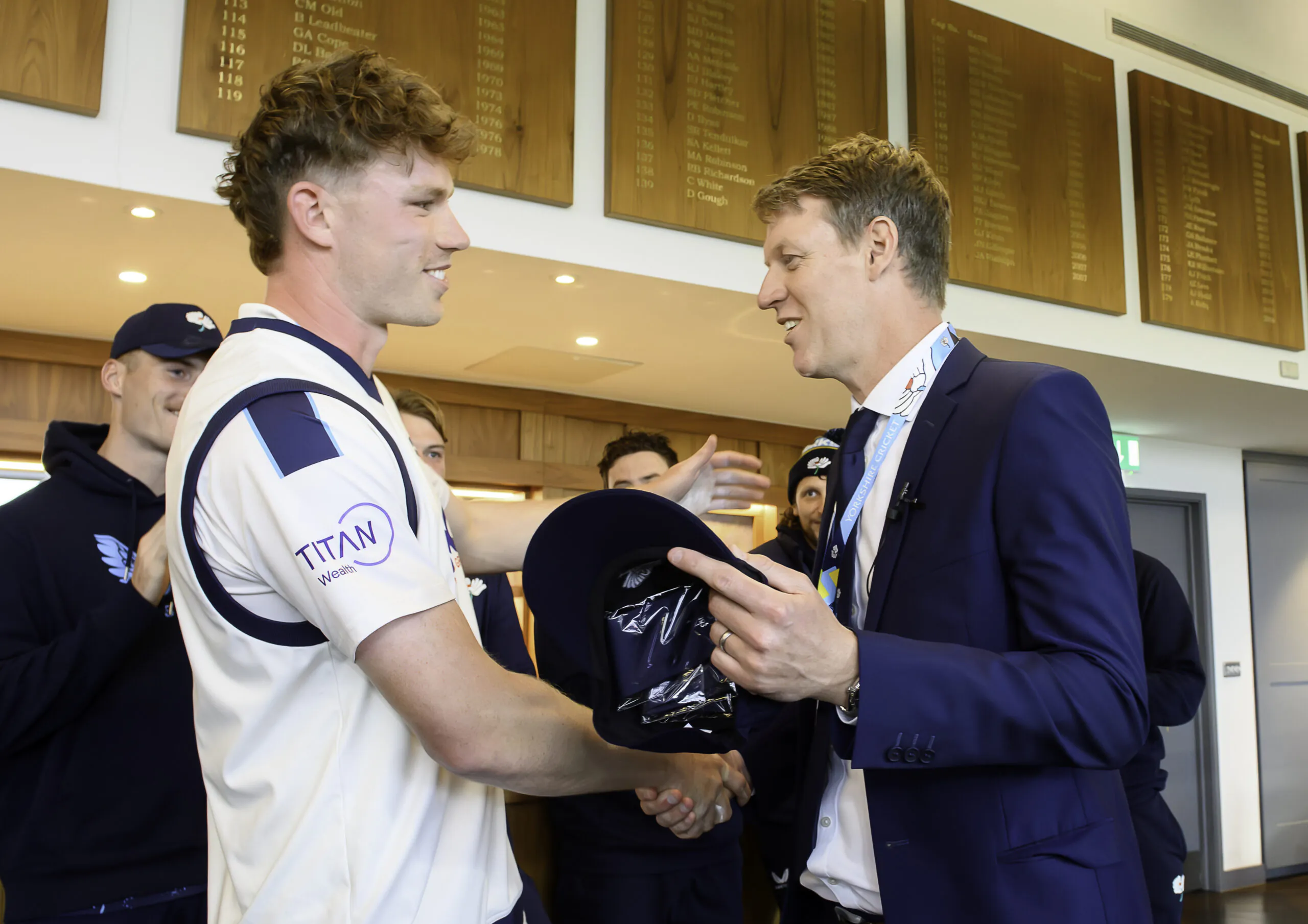 Picture by Allan McKenzie/SWpix.com – 12/04/2026 – Cricket – Rothesay County Championship – Yorkshire County Cricket Club v Hampshire County Cricket Club – Headingley Cricket Ground, Leeds, England – Yorkshire’s James Wharton is presented with his County Cap by General Manager of Cricket Gavin Hamilton.