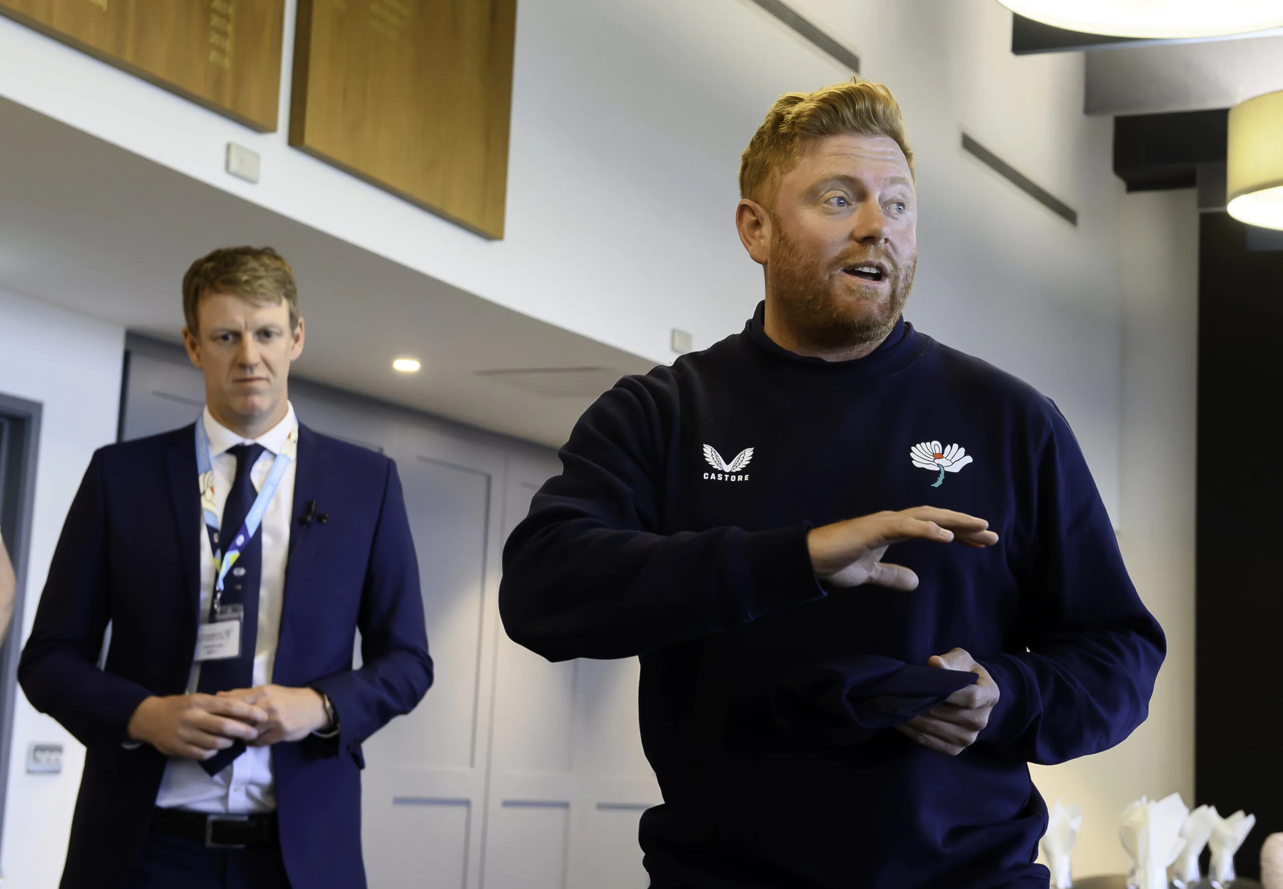 Picture by Allan McKenzie/SWpix.com – 10/04/2026 – Cricket – Rothesay County Championship – Yorkshire County Cricket Club v Hampshire County Cricket Club – Headingley Cricket Ground, Leeds, England – Jonny Bairstow prepares to present James Wharton with his County Cap.