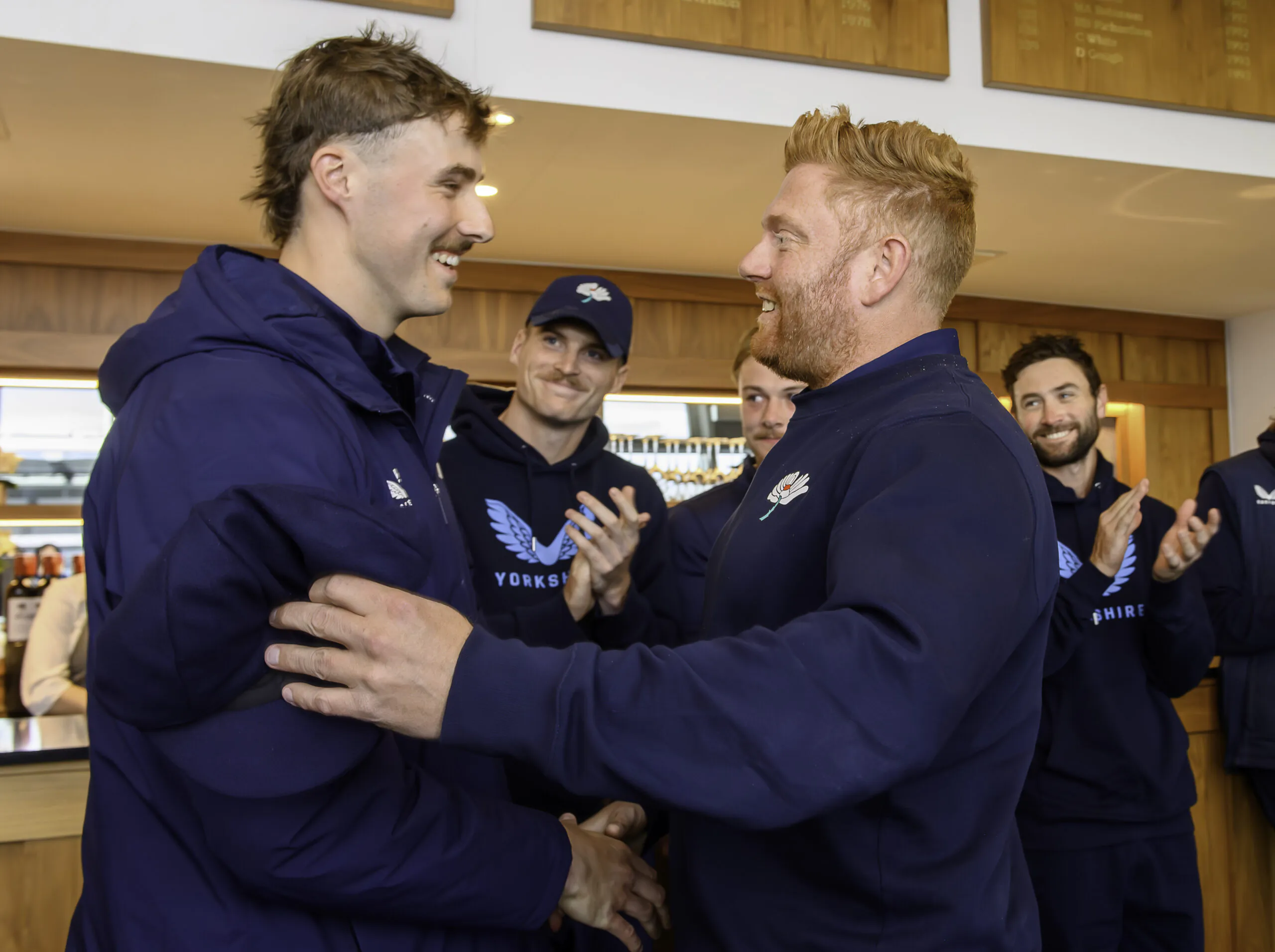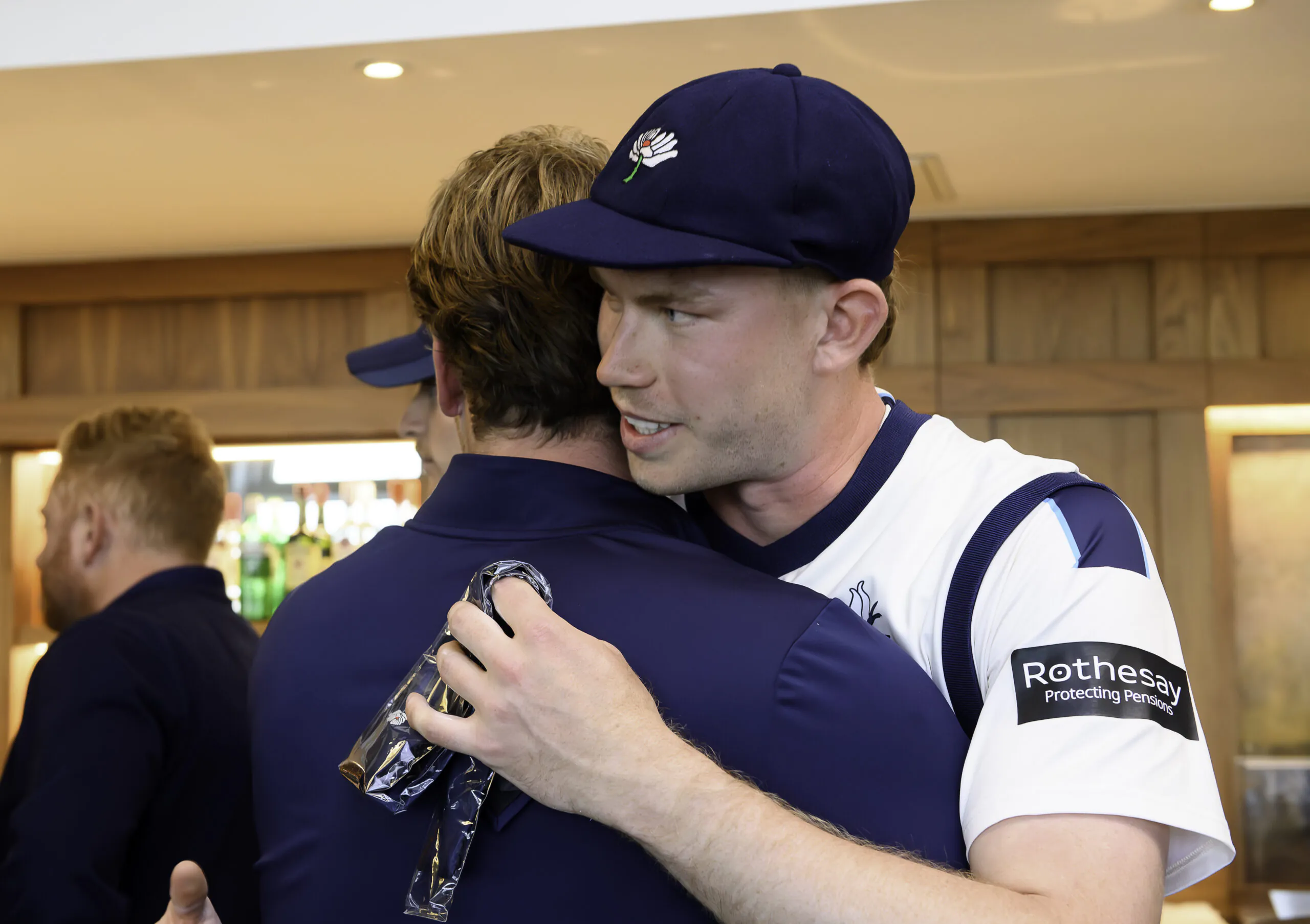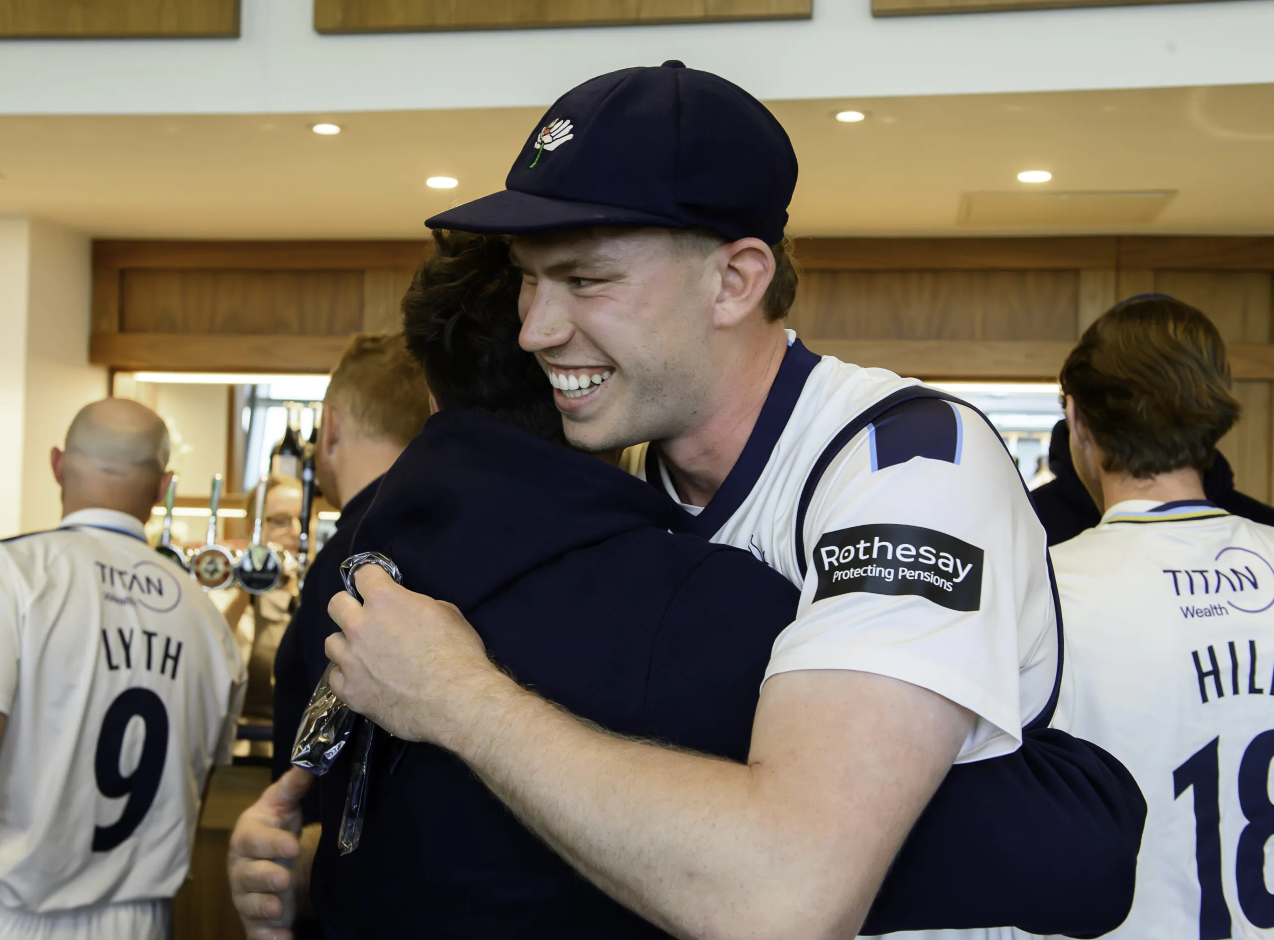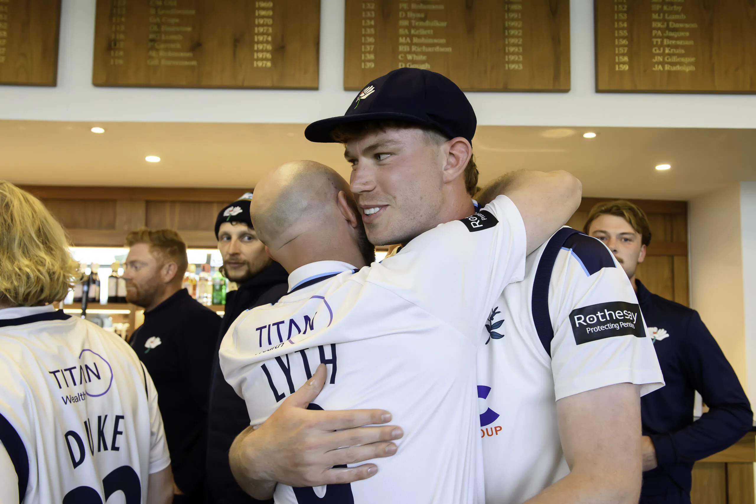 Picture by Allan McKenzie/SWpix.com – 10/04/2026 – Cricket – Rothesay County Championship – Yorkshire County Cricket Club v Hampshire County Cricket Club – Headingley Cricket Ground, Leeds, England – James Wharton is congratulated by team mates after being awarded his county cap.