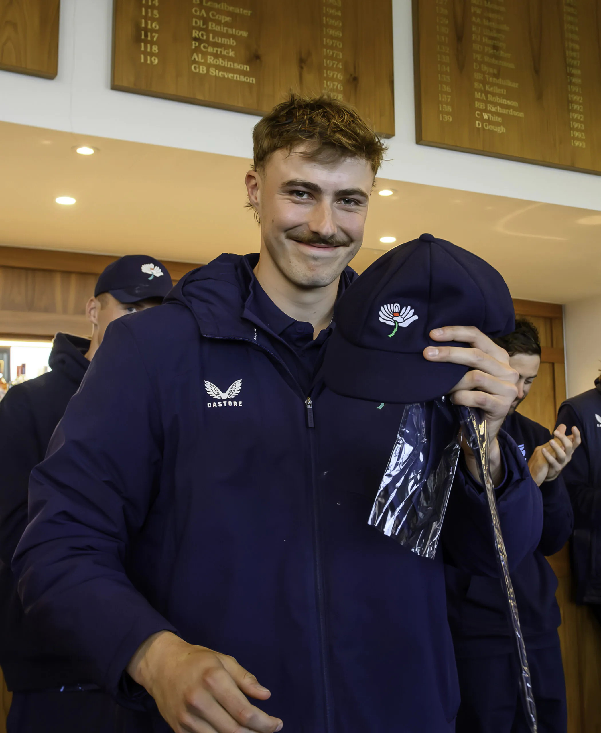 Picture by Allan McKenzie/SWpix.com – 10/04/2026 – Cricket – Rothesay County Championship – Yorkshire County Cricket Club v Hampshire County Cricket Club – Headingley Cricket Ground, Leeds, England – Matthew Revis with his County Cap.