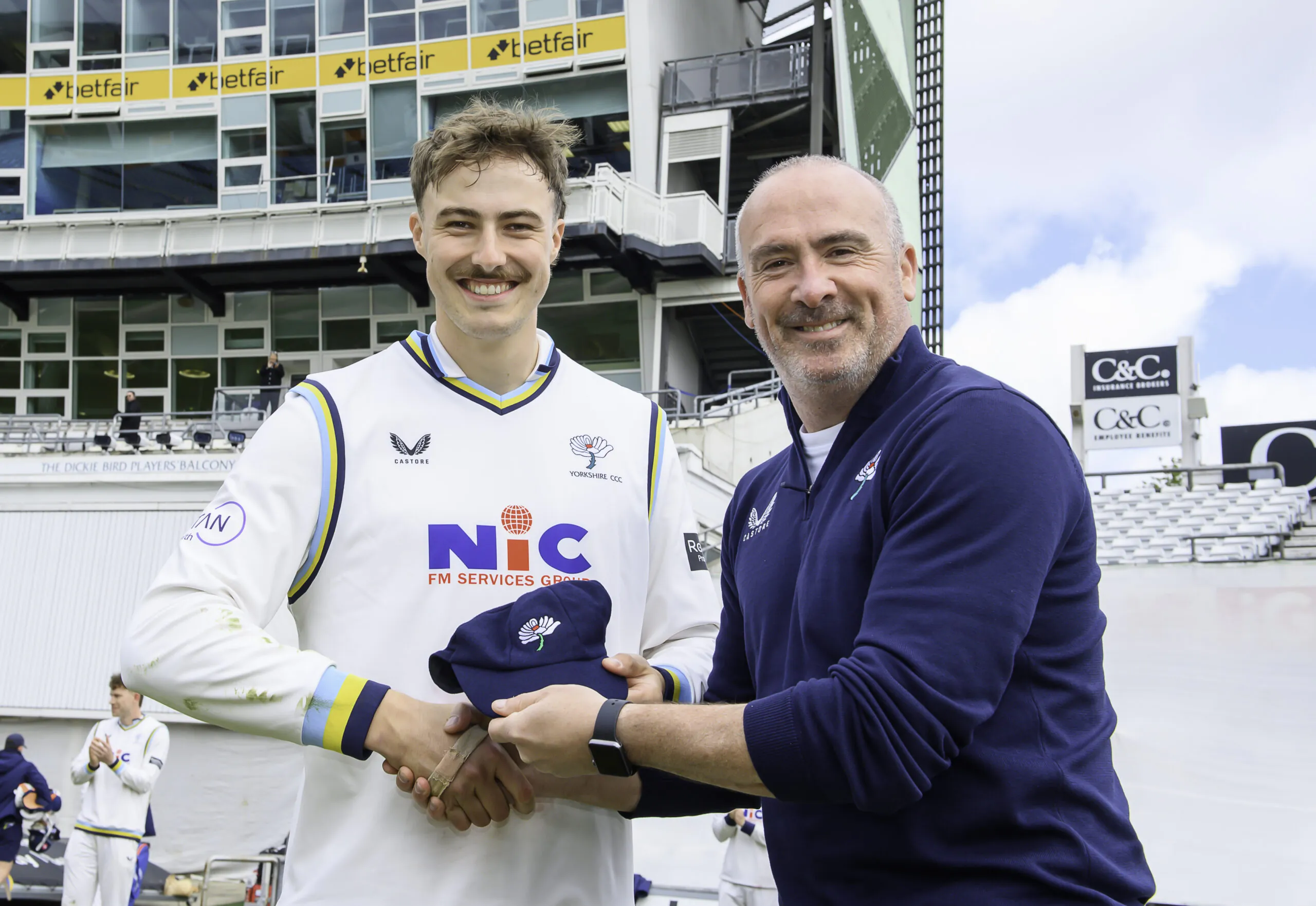 Picture by Allan McKenzie/SWpix.com – 10/04/2026 – Cricket – Rothesay County Championship – Yorkshire County Cricket Club v Hampshire County Cricket Club – Headingley Cricket Ground, Leeds, England – Steven Patterson presents Matthew Revis with his County Cap.