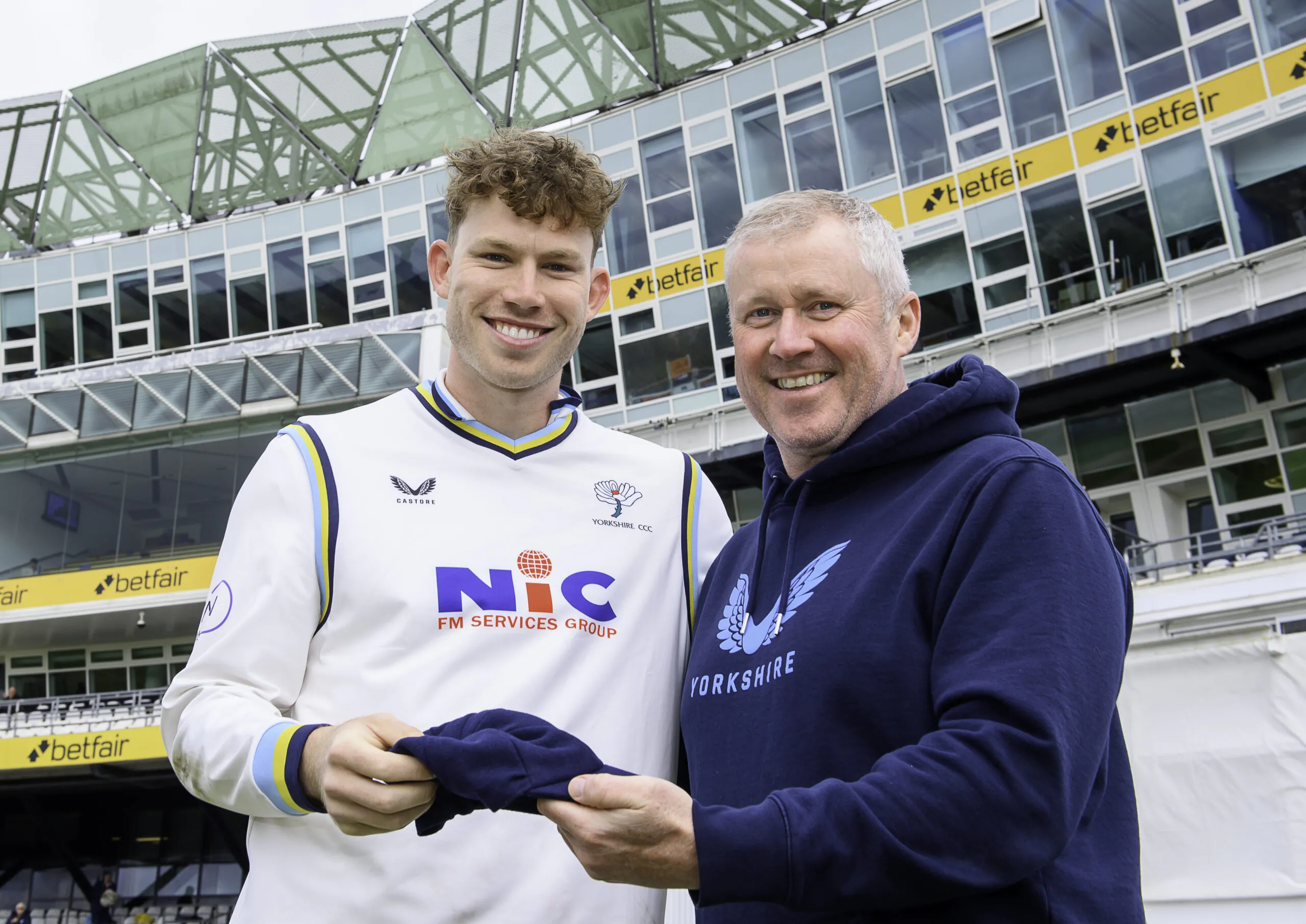 Picture by Allan McKenzie/SWpix.com – 12/04/2026 – Cricket – Rothesay County Championship – Yorkshire County Cricket Club v Hampshire County Cricket Club – Headingley Cricket Ground, Leeds, England – Yorkshire’s Matthew Revis is presented with his County Cap by Head Coach Anthony McGrath.