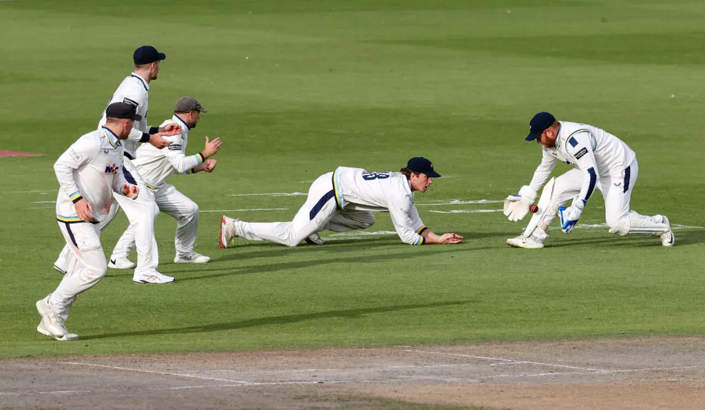 George Hill parries an initial catch onto the boot of Jonny Bairstow, who grabs the catch to get rid of Oli Carter off Matt Milnes.