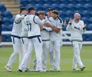 Picture by John Heald. Dom Bess takes the congratulations after helping Jack White remove Glamorgan skipper Kiran Carlson.