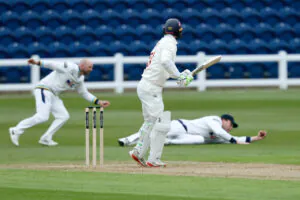 In the 12th, Sean Dickson edged a drive at the same bowler, with Bairstow taking a one-handed catch going low to his right in front of first slip – 21-3.