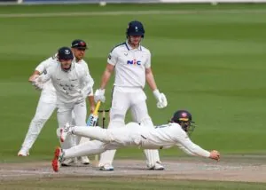 Adam Lyth chipped to mid-wicket before Mayank Agarwal was caught at slip pushing forwards. In his next over, the England Lion had Fin Bean caught by short-leg diving forwards off a combination of inside-edge and thigh pad.