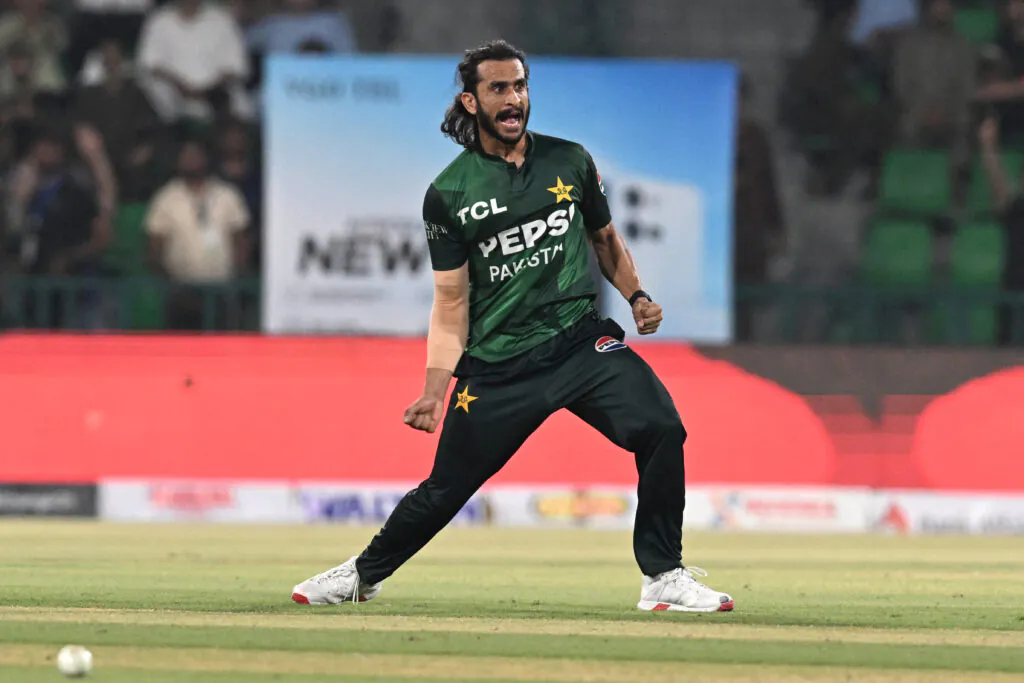 Pakistan’s Hasan Ali celebrates after taking the wicket of Bangladesh’s Tanzid Hasan during the first Twenty20 international cricket match between Pakistan and Bangladesh at the Gaddafi Cricket Stadium in Lahore on May 28, 2025. (Photo by Aamir QURESHI / AFP) (Photo by AAMIR QURESHI/AFP via Getty Images)