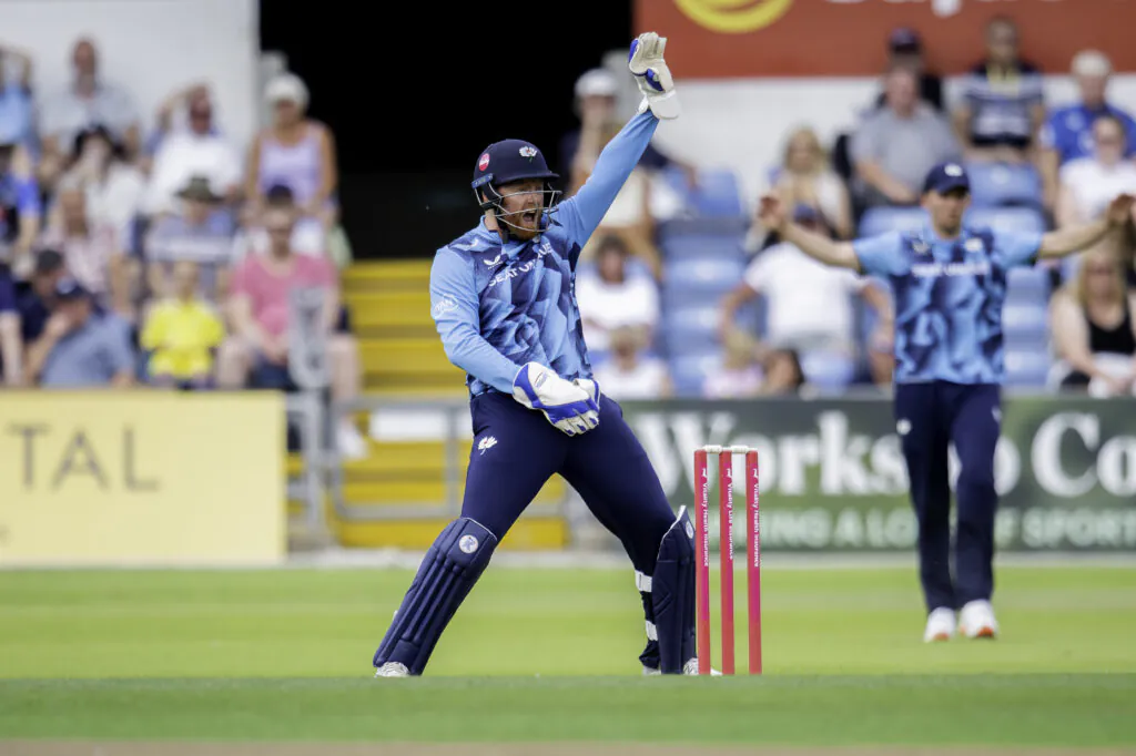Picture by Allan McKenzie/SWpix.com – 13/07/2025 – Cricket – Vitality Blast – Yorkshire’s Jonny Bairstow appeals against Derbyshire.